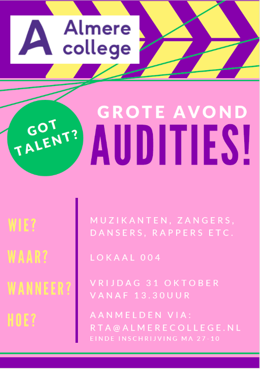 De audities zijn op vrijdag 31 oktober 2025 vanaf 13:30 op het Almere college aan de Marinus Postlaan.